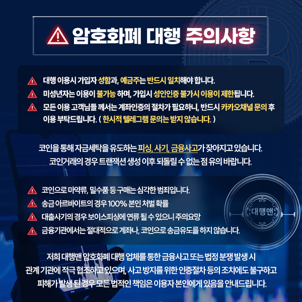 신청 할 대행과 금액 및 정보[계좌 또는 코인지갑주소] 확인 후 신청해 주시면 됩니다.